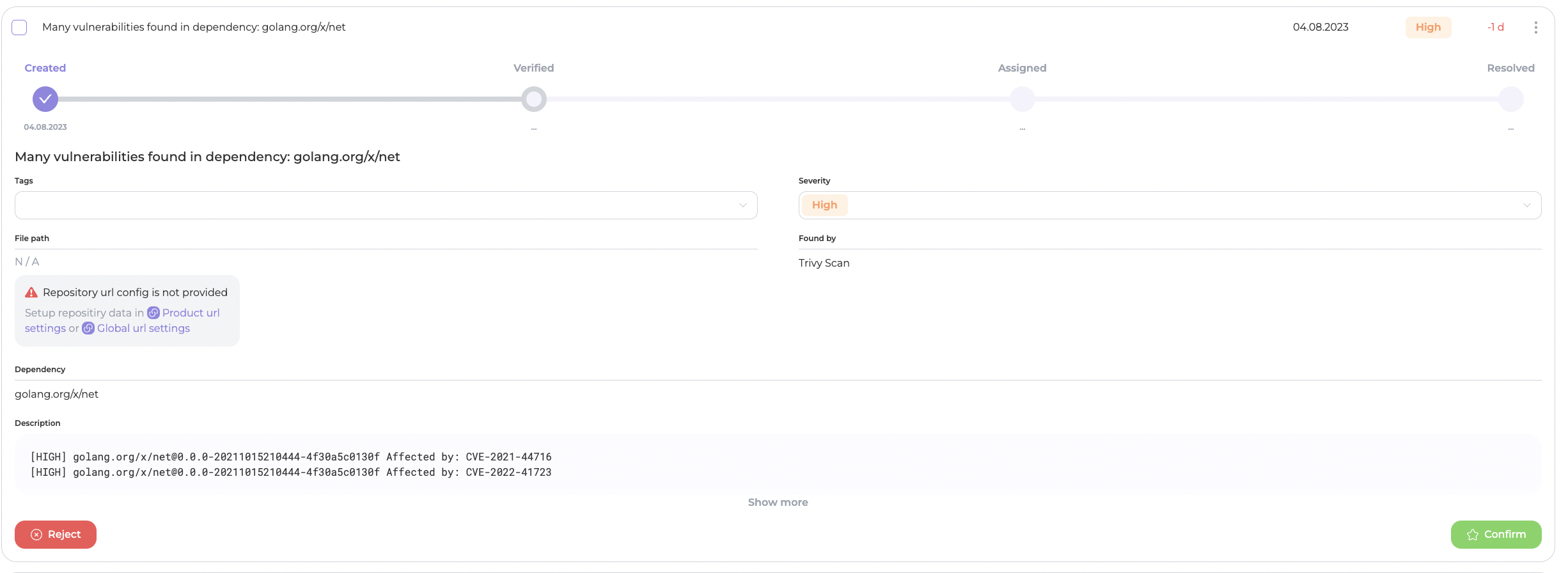 **Deduplication in the description field:** During vulnerability grouping, the system compiles vulnerabilities that match the selected criterion (Vulnerable URL, Dependency, File Path) into a list. When creating a description for a grouped vulnerability, deduplication occurs. Deduplication involves the system using a set for all descriptions within the group, removing duplicate lines.