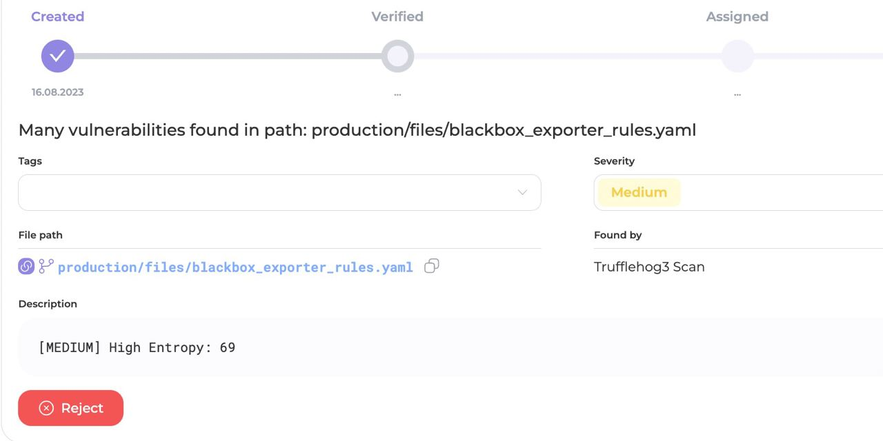 <figure><img src="https://3069717380-files.gitbook.io/~/files/v0/b/gitbook-x-prod.appspot.com/o/spaces%2F-M81VrXQrfSaYjNIFOtt%2Fuploads%2FMV8keBANQ0xZMcDTvdhT%2Fimage.png?alt=media&#x26;token=40cab75a-72f8-4123-9386-5d43a82fab8e" alt=""><figcaption><p>This signifies the existence of multiple vulnerabilities with "Medium" severity and the description "High Entropy" at line 69</p></figcaption></figure>