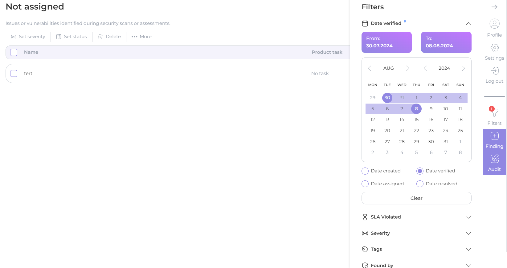 You can filter your findings not only by **date of creation**, but also by **verification date**, **assignment date** and **resolving date**:
